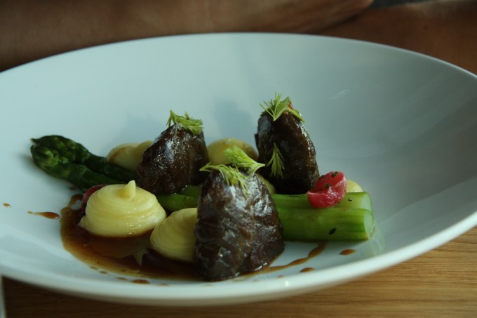 Pork cheek, asparagus and spruce shoots
