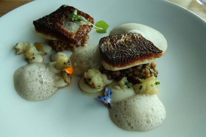 Whitefish fried crisp, mushroom foam, cauliflower, lentils and rice